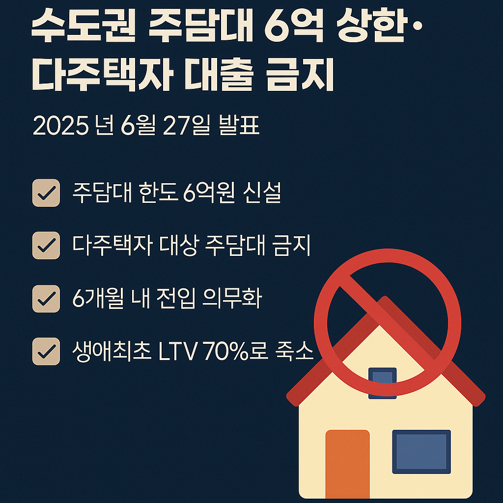 이번 규제의 핵심은 “수도권 주택담보대출 한도 신설”, “다주택자 대출 전면 금지”, “전세대출 규제 강화“이며, 2025년 6월 28일부터 즉시 시행된다.